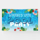 Is your child having a Pool Party? Then check out this cool summer pool party banner featuring clear blue water, inflatables, tropical leaves, yellow flowers and a trendy birthday template that can easily be personalised.