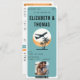 A trendy design of an aeroplane ticket wedding invitation with a tropical destination theme (Hawaii etc.) featuring a modern illustration of an aeroplane taking off over waves and palm trees, with the glowing sun in the background,, will delight couple and guests, looking forward to the big day. Template for a picture of the happy couple. An all in one modern wedding invitation that includes the details on the back and the RSVP card with a QR code.