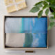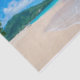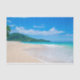 Tissue paper with a photograph of a gorgeous vacation location. Bright blue sky, soft sandy beach with tropical crystal clear blue waters. A lush tree covered mountain in the background. Scenic and tranquil photography.