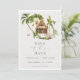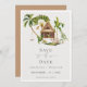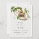 This wedding save the date invitation is a tropical jungle design with the colours of nature. It features palm trees, luscious rainforests, and bungalows nestled within a beautiful tropical paradise setting.