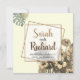 The main card showcases a cream background adorned with muted tropical florals and foliage, including monstera leaves and hibiscus flowers. A geometric gold frame anchors the central text, which announces "Sarah weds Richard" in a stylish script font. The venue and date details are presented in a clean, modern typeface.