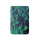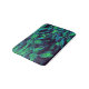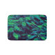 The abstract fabric pattern by HomeWare on this small Bath Mat was created from an original photograph of a royal poinciana tree. Some of the tree's tropical leaves are in sunlight, in bright yellow greens. Others are in shadow, in shades of blue from aqua to deep teal, with purple highlights. The background is almost black. The design has an overall fabric texture.