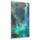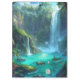 Multiple waterfalls cascade into a glowing turquoise pool, surrounded by lush jungle and radiant crystals.
