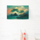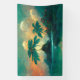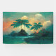 This is a watercolor tropical fantasy view in turquoise and orange tones, depicting the sky, clouds, sea, palm trees during sunrise.