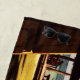 Tropical Fiji Beach Scene - Photograph of a beach in the Fiji Islands with palm trees, hammocks and a picnic bench seen through the open shutters of a beach hut.