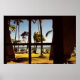 Tropical Fiji Beach Scene - Photograph of a beach in the Fiji Islands with palm trees, hammocks and a picnic bench seen through the open shutters of a beach hut.