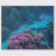 Tropical fish swim around beautiful purple colored sea coral in this undersea photo scene.