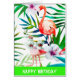 A tropical theme artwork of a pink flamingo and green tropical jungle plants with hibiscus flowers and palms against a neutral white background. A fun and colourful art piece.