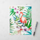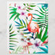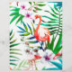 A tropical theme artwork of a pink flamingo and green tropical jungle plants with hibiscus flowers and palms against a neutral white background. A fun and colourful art piece.