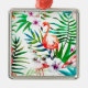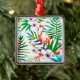 A tropical theme artwork of a pink flamingo and green tropical jungle plants with hibiscus flowers and palms against a neutral white background. A fun and colourful art piece.
