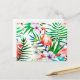 A tropical theme artwork of a pink flamingo and green tropical jungle plants with hibiscus flowers and palms against a neutral white background. A fun and colourful art piece.