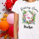Tropical Flamingo Birthday Queen T-shirt for Women. Pink flamingo surrounded by tropical flowers and also, tropical drink are included in the design. Pineapple image is perfect for party vibes. Personalised. Combination of human and novel AI art.