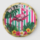 This vibrant round timepiece offers a sunny Aussie welcome with a tropical flair. A striking pink flamingo stands gracefully against a backdrop of alternating pink and turquoise vertical stripes. Lush green monstera leaves and colourful hibiscus flowers in pink, red, and yellow frame the flamingo. The bold word "WELCOME" arcs across the top in pink and white lettering. The timepiece features a shiny gold-toned frame, adding a touch of glamour to this summery Australian greeting.