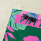 Modern, trendy floral beach towel with a pink flowers and green tropical leaves with a purple backgroud.Personalised it with your name.