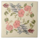 A tropical botanical floral print tile on an textured oatmeal background. Featured are small shell pink allamanda vines, maroon abutilon florets and buds, and ferny silvery foliage. Work one or two into your backsplash for your herbal/botanical style kitchen.