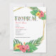 Exotic Tropical Invitations featuring floral blossom "tropical" letters with exotic palm trees and watercolor tropical floral pattern on the back.