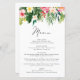 Customisable lemon wedding menu card. It features watercolour illustrations of palm leaves, banana leaves, hibiscus, plumeria and other tropical plants. This tropical menu card is perfect for summer weddings, baby showers, bridal showers, birthdays, and so much more.