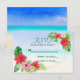 This RSVP card matches the tropical floral wedding invitations. A gold geometric frame is offset by mixed media tropical bouquets. The photographic bright red and pink hibiscus and white plumeria pair well with the watercolor tropical leaves. The watercolor tropical beach background completes the theme.