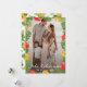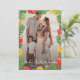 Beautiful floral photo Mele Kalikimaka card featuring a photo inside a botanical frame of red and yellow hibiscus and tropical leaves on the front and a floral pattern at the back.