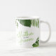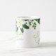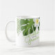 Beachy, botanical floral Mother of the Groom mug- Trendy, tropical palm leaves design. It reads 'Mother of the Groom' in elegant, green script lettering on both sides. Bordered with tropical palm leaves, green banana leaves, and pretty Hawaiian plumeria flower botanical design in shades of green on a white background. Matches modern weddings, summer beach weddings, botanical garden wedding styles, green wedding colour schemes, and tropical destination weddings. Elegant wedding party gift for mothers. MATCHING FLORAL TROPICAL WEDDING PARTY mugs and wedding favour supplies are also available in our Zazzle.com/angela65 shop, as well as other Mother of the Groom gifts.