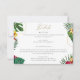 Details card with tropical design, palm leaves, yellow & red loral and gold geometrics.
