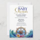 Celebrate the upcoming arrival of a sweet baby boy with this charming nautical baby shower invitation featuring a beautifully illustrated ship wheel surrounded by ocean waves and tropical flowers. The classic navy blue and gold color palette creates an elegant coastal theme that is perfect for seaside gatherings, sailing enthusiasts, or ocean-inspired celebrations.