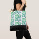 This tote bag is shown with a cute tropical flowers print design in a in the Green colours on a white background colour with a Black coloured accent strip at the bottom.