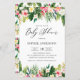 Celebrate your upcoming bundle of joy with this beautifully customisable baby shower invitation featuring a vibrant tropical theme. Featuring watercolor garlands of plumeria, hibiscus, and other exotic blooms, this elegant card is framed with tropical greenery, including palm leaves and banana leaves. It is perfect for a summer baby shower, luau-themed party, or any island-inspired celebration.