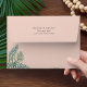 Elegant, beachy blush pink envelopes for your 5x7 wedding invitations feature your return address pre-printed on the back flap. Tropical palm frond leaves in green watercolors peek out at the corners on the back and front. Envelopes open to reveal a pastel green and white striped lining.