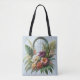 Imagine a tote bag perfect for errand runs, decorated with Hawaiian-style tropical foliage featuring an arched window with hibiscus flowers and ferns adorning it. Gentle shades of earth tone colours complemented by a range of ferns and foliage. The back side has a different view of similar floral greenery.