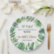 Tropical foliage and gold effect animals baby shower party paper plates. Hand painted watercolor foliage, script text and gold animals make this a fun, modern baby shower theme.
