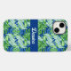 Beautiful tropical leaves and palm fronds in shades of green, on a royal blue background creates a gorgeous and luxurious phone case. A blue ribbon, in the same shade as the background, holds your name in pale green.