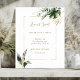 This wedding dessert bar sign features watercolor green tropical foliage, monstera, palm tree leaves, banana leaves, and faux gold leaves with a gold rectangle frame. It's perfect for a beach or destination wedding.