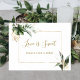 This wedding dessert bar sign features watercolor green tropical foliage, monstera, palm tree leaves, banana leaves, and faux gold leaves with a faux gold rectangle frame. It's perfect for a tropical, beach or destination wedding.