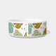 This is a heavy, durable bowl decorated with Tibbies of many colors, the perfect size for hungry/thirsty Tibs. The design is interesting and printing clear.