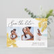 Announce your summer, destination or beach wedding with these tropical chic save the date cards featuring three square photos aligned side by side. Tropical palm leaves in real gold foil appear at the corners, with "save the date" and your wedding details in an elegant mix of modern hand lettered script and traditional serif typography.