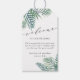 Attach these island chic tags to your wedding welcome bags to greet your guests in elegant style. White tags feature a tropical watercolor palm frond leaves in lush green peeking out from the top and bottom, with "welcome" and your names and wedding date, along with a customizable message. Tags reverse to pastel sea green. Designed to match our Tropical Foliage wedding collection.