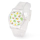 I only have one complaint. I ordered the watch with clear case and strap, and what was sent was white case and strap. I'm going to keep it because 1) it looks very nice in white, and 2) it would take too long to get a replacement made and sent in time for my occasion. Aside from the mix up with the color, the watch does look very good in white. The purple dial is actually sparkly which did not show in the online images. That was a nice surprise. If you like Swatch watches this is very similar to those. It's 33.6mm in diameter, 10.5mm thick, and 40.6mm lug to lug. Stainless steel case back says 3ATM/30m WR, so no swimming or showering or submerging this one. If you like Woodstock, this is a great choice.