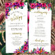 This beautiful wedding program features an elegant tropical garden design with hibiscus flowers and bird of paradise in vibrant shades of hot pink, fuchsia, purple, and yellow, along with palm leaves and tropical greenery. The titles are written in fancy gold script calligraphy, and there is space for your ceremony and wedding party details, as well as a short thank you for your guest. Wonderful way to welcome your friends and family to your wedding celebration. Perfect for destination weddings in exotic locations.