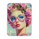 A captivating retro-glam digital illustration of a stylish woman wearing oversized pink sunglasses and a vibrant floral crown. Surrounded by tropical skies, palm trees, and sailboats, this dreamy artwork exudes vintage beach elegance and high fashion charm. Perfect for Redbubble products like posters, phone cases, apparel, and stickers, it brings bold colour, beauty, and summer vibes to any collection.