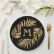 Stylish, elegant faux gold glitter tropical palm tree fronds on a black background with a gold monogram initial are featured on these paper plates - available in