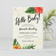 Baby shower invitation with greenery tropical leaves, red & yellow hawaiian floral & gold geometrics