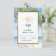 Provide your guests to reply to your wedding invitation with this elegant RSVP card featuring modern script, ocean blue and gold text including an artistic palm tree and metallic gold frame on the front of the card. A transparent photo of two connecting palm trees on a white sandy beach with turquoise water adorns the front and back of the card which you can replace with your own photo.