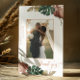 The background is a pristine white canvas, providing a striking contrast to the vivid greenery and metallic hues. At the centre of the card is framed wedding photo , bellow photo calligraphy spells out "Thank You," complemented by a personalised message (backside) from the couple, making each card unique and heartfelt.