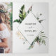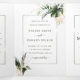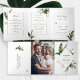 This all in one tri-fold wedding invitation card features watercolor green tropical foliage, monstera leaves, palm tree leaves, banana leaves with faux gold leaves accents, add wedding details, rsvp, and your photo. It's perfect for a tropical, summer, beach, or destination wedding.