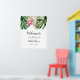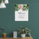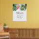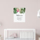 Modern bridal shower welcome sign featuring watercolor illustration of monstera leaves, palm leaf, and pink king protea flower. Perfect for your summer party.