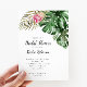 Modern tropical theme bridal shower invitation card featuring watercolor illustration of monstera, pink king protea flower, and palm leaves.