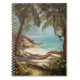 This notebook cover features a serene tropical beach scene with a hammock strung between palm trees, overlooking turquoise waters and golden sand. The lush greenery frames the tranquil shoreline, inviting you to relax and drift into daydreams. Perfect for journaling, creative writing, or planning your next getaway.