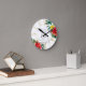 This custom wall clock features a tropical beach or island wedding theme. The background is a simple and elegant white with colourful, tropical Hawaiian flowers. Floral bouquets with palm leaves, hibiscus, and frangipani flowers accent the borders.