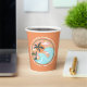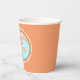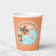 Simple classic cork textured looking paper cup with fun colourful retro Illustration image of green palm trees, blue waves, orange sun, and yellow and pink sunrays. Surrounded by words related to summertimes... Waves, Beach Parties, Good Vibes, Cocktails, Summer, Friends, Laughter, Sun and Surf. Really cool paper cups for use during bbq beach of backyard parties and to have in stock at your patio or poolside tiki bar.